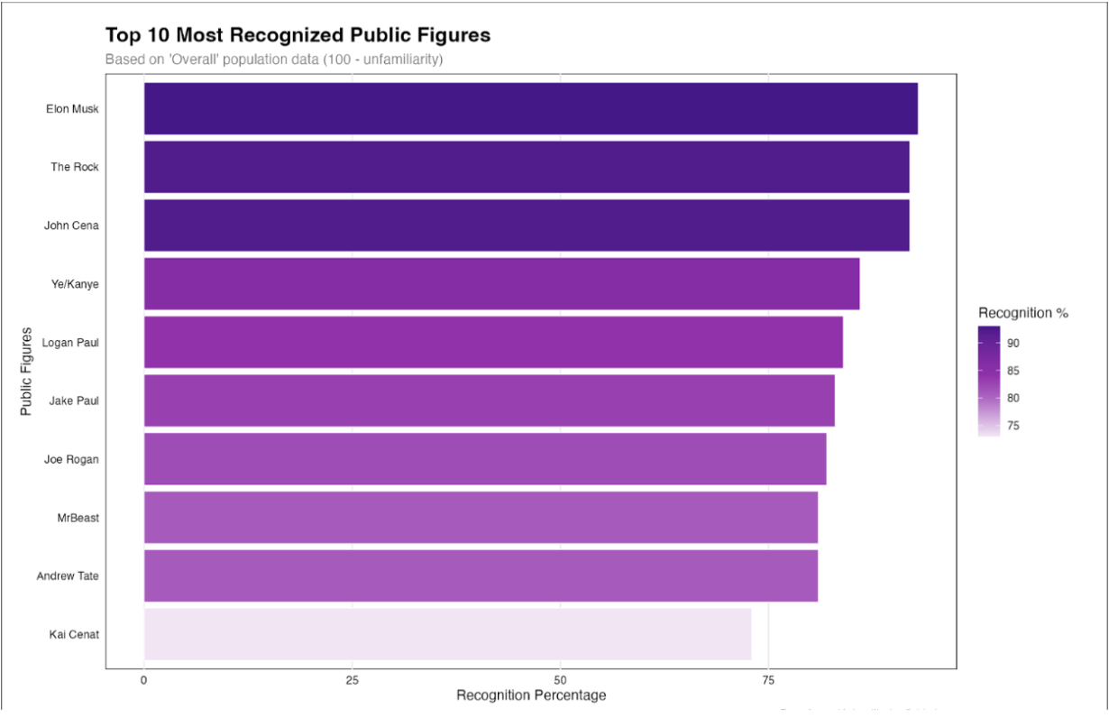 Elon Musk achieved the highest overall name ID at 93 percent, followed closely by Dwayne “The Rock” Johnson and John Cena (both at 92 percent). In total, content creators and social media influencers comprised half of the top ten most recognized figures, including the Paul brothers, Andrew Tate, MrBeast, and Kai Cenat.